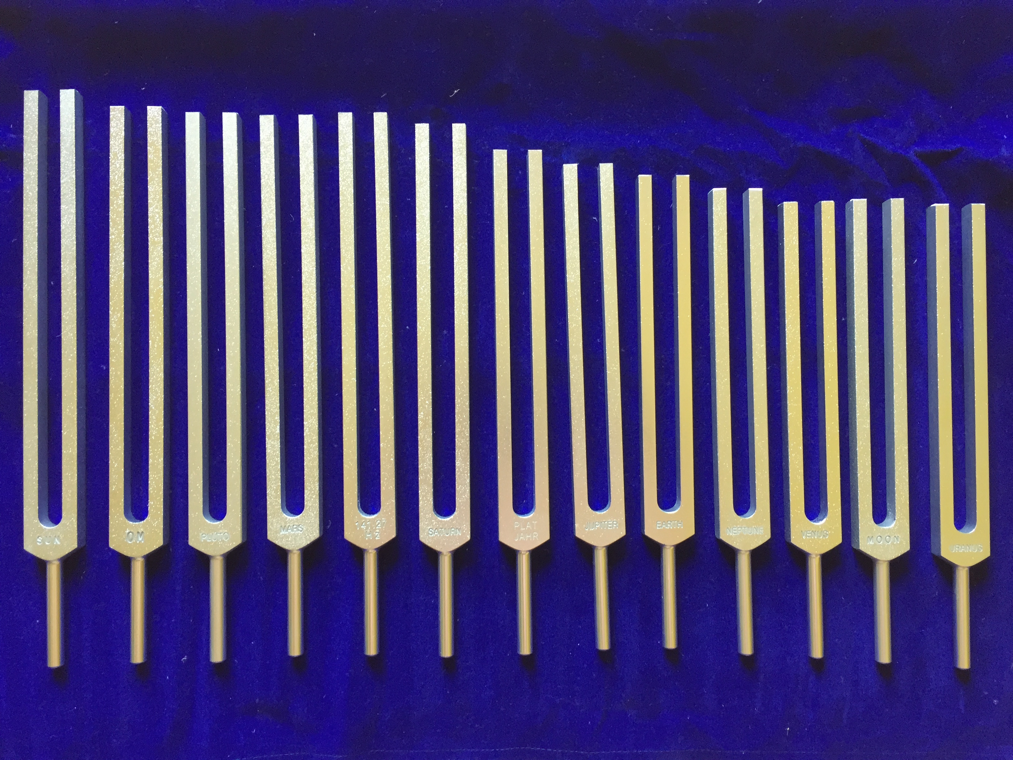 Stimmgabeln gibt es in verschieden Formen und Größen. Meist sind sie aus Metall. Für therapeutische Zwecke eignen sich Stimmgabeln mit geeichten Tönen und präziser Abstimmung der Frequenzen. Gern gewählt werden die sogenannten Planeten- oder Chakrastimmgabeln, denen jeweils bestimmte Frequenzen zugeordnet sind. Beim Kauf ist auf Abstimmung und Frequenz (z. B. 126,22 für das 3. Chakra und den Sonnenton) sowie ein gutes und langes Schwingverhalten zu achten. Der menschliche Körper ist ein Resonanzkörper, der auf Klänge, Töne und Schwingungen reagiert. Wir befinden uns in einem ständigen Wandel und unterliegen einem Rhythmus, wie beispielsweise unserem Herzschlag und unserer Atmung. Alte Zellen sterben ab und neue bilden sich in jeder Sekunde. Jede einzelne Zelle unseres Körpers ist in Bewegung, ohne dass wir es bewusst wahrnehmen. Eine schwache, funktionell gestörte oder kranke Zelle schwingt nicht mehr in ihrem typischen Rhythmus. Um dies auszugleichen, können wir die Zellen an ihren Ur-Ton erinnern, indem wir von außen beispielsweise durch eine Klangschale oder eine Stimmgabel Schwingungen erzeugen.